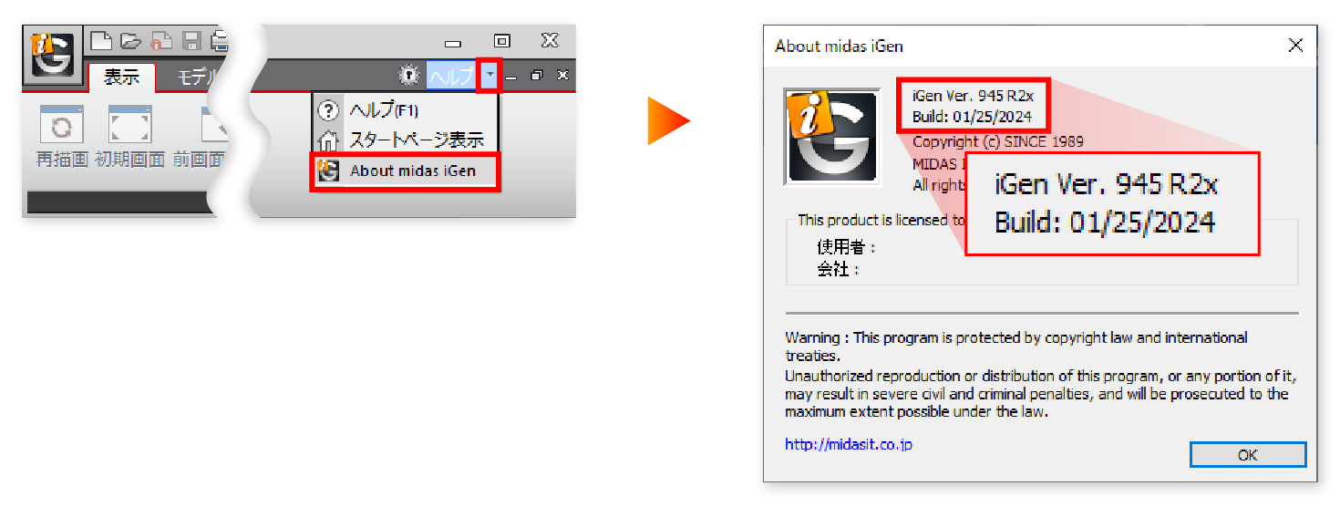 4.パッチ処理後、以下の方法で midas iGen Ver.945R2x へ更新されたことを確認します。