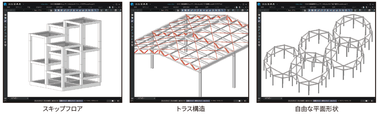 通りや層にとらわれずに自由にモデリングができるので、スキップフロアやトラス構造など複雑な形状の建物を設計する時に