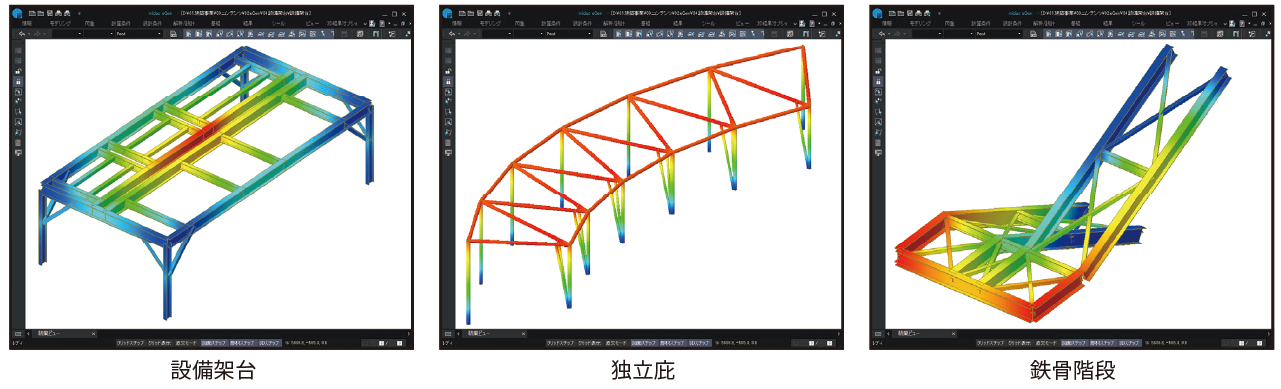 建物以外のモデルリングもできるので、設備架台や庇、鉄骨階段などの応力解析や断面検定にもご利用いただけます。
