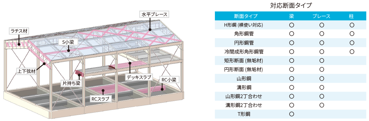 スラブや小梁などの2次部材の断面検定や、山形鋼などの一般形鋼断面を利用したいときにもご活用いただけます。